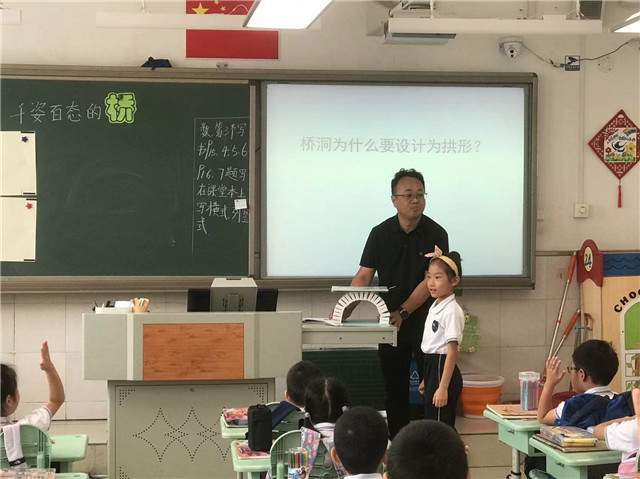 2023年9月19日,白家庄小学教育集团刘飞书记到南校听课指导。杨耀辉老师进行了跨学科主题课程《千姿百态的桥》,科任组老师和程淑娟主任、李海玲主任共同听课。本节课是杨老师设计的美术与信息科技学科跨学科主题课程,通过让学生了解身边千姿百态的桥,感受中国传统建筑文化的艺术魅力,了解拱桥的结构与造型。 杨老师通过让同学们分析在生活中见过的拱桥,配合图片进行观察,了解其构架分为桥墩,桥拱,桥身,桥栏四个部分。课堂中讲述了为何设计拱桥这一造型,为了让同学们更直观地感受拱形的支撑力,杨老师展示了拱形的结构学具,请多位同学尝试将重物放在拱形学具上,让全班同学感受到了拱形的支撑能力。在创作讨论的过程中,同学们分享了自己的创作思路,完善构思,并将整个思路拓展清晰,使本堂课的作品创作更加丰富。通过本节课,同学们丰富了桥梁造型的知识,为之后的信息课程中进行电脑绘画奠定了造型的基础。课后,刘飞书记对本节课进行了点评,刘书记充分认可课程从跨学科主题方面的设计理念,指出可以联合多学科进行内容组合,从传统文化的角度设计多学科、跨学科主题课程。程淑娟主任与李海玲主任也针对课堂进行了点评,并建议课程与中轴线主题课程相结合,以创作更加丰富的课堂成果。