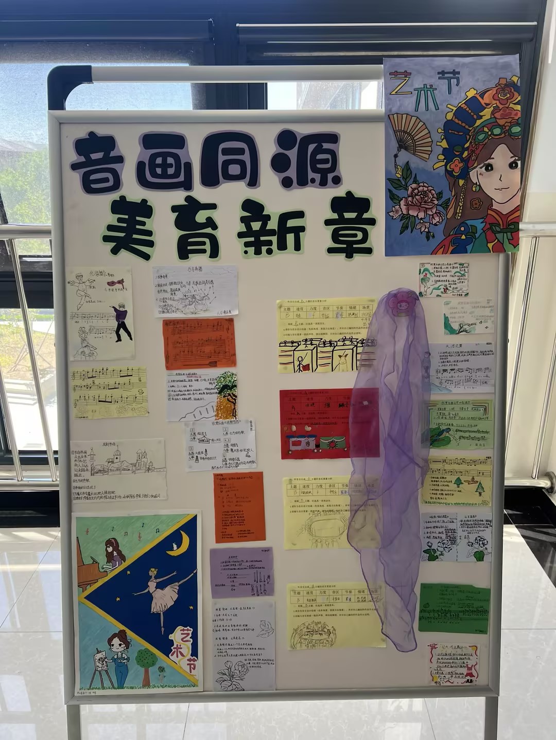 艺音笔记展,高年级学生以“音画同源 美育新章”为主题,通过音乐课堂的记录,色彩的搭配,构图的设计呼应不同单元不同音乐的旋律主题,每一页笔记都记录了他们对“美”的理解,展示了同学们在艺术与音乐学习中的思考与探索。