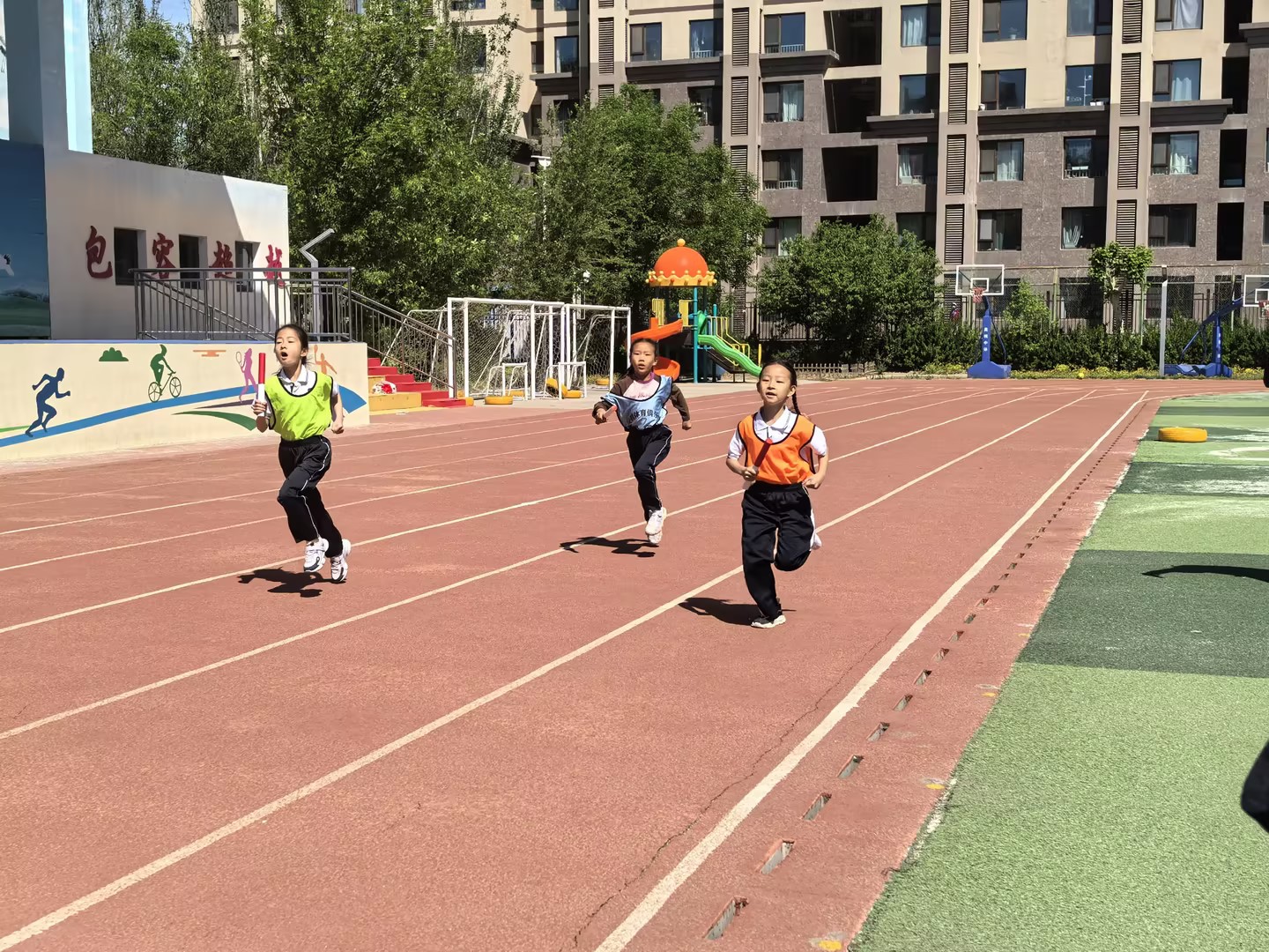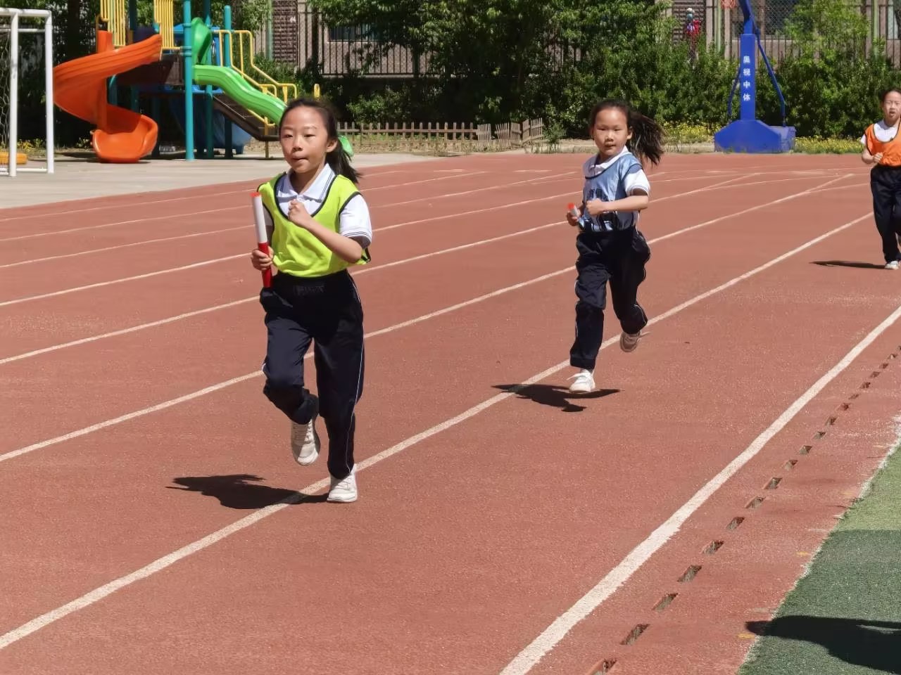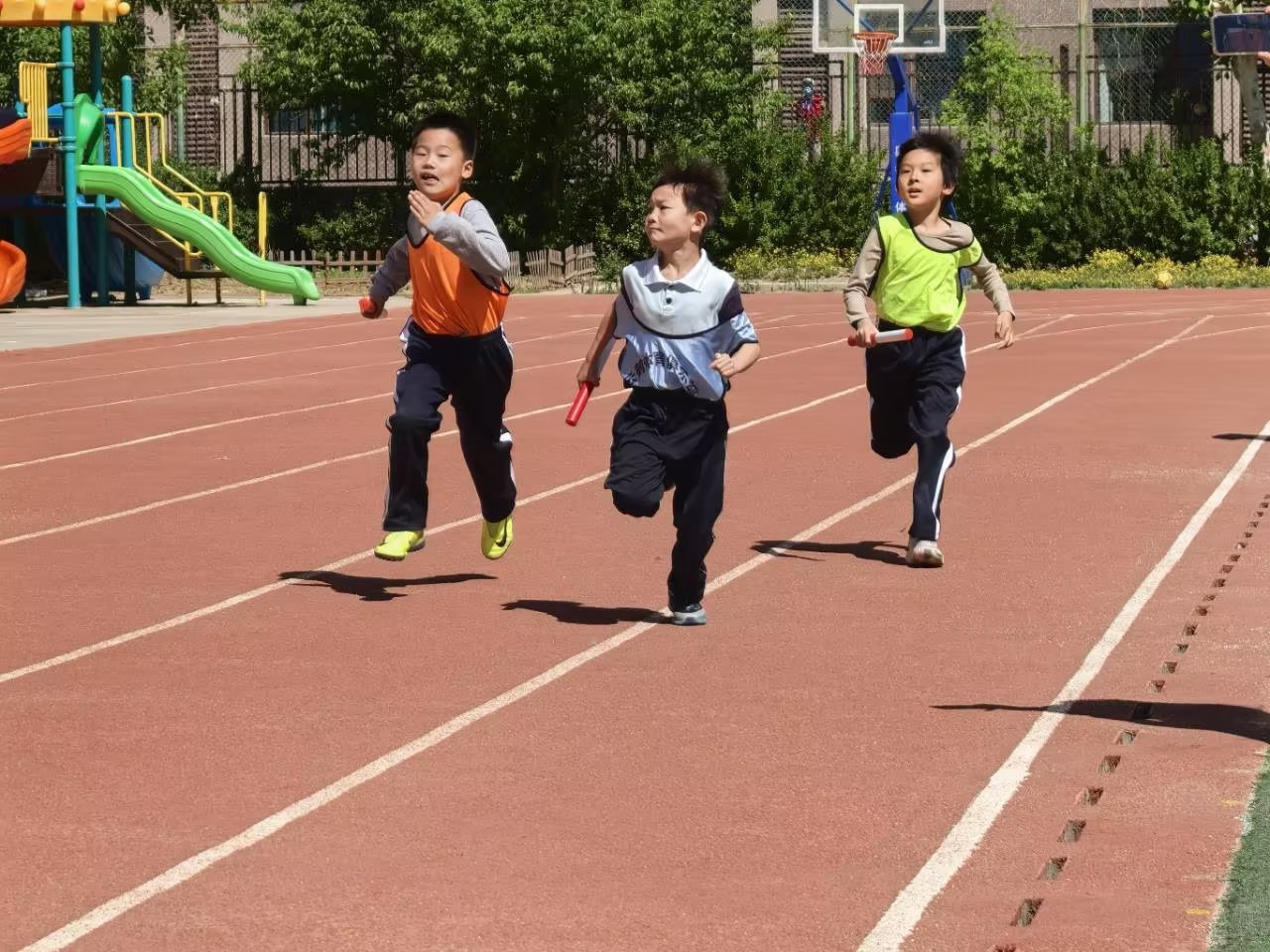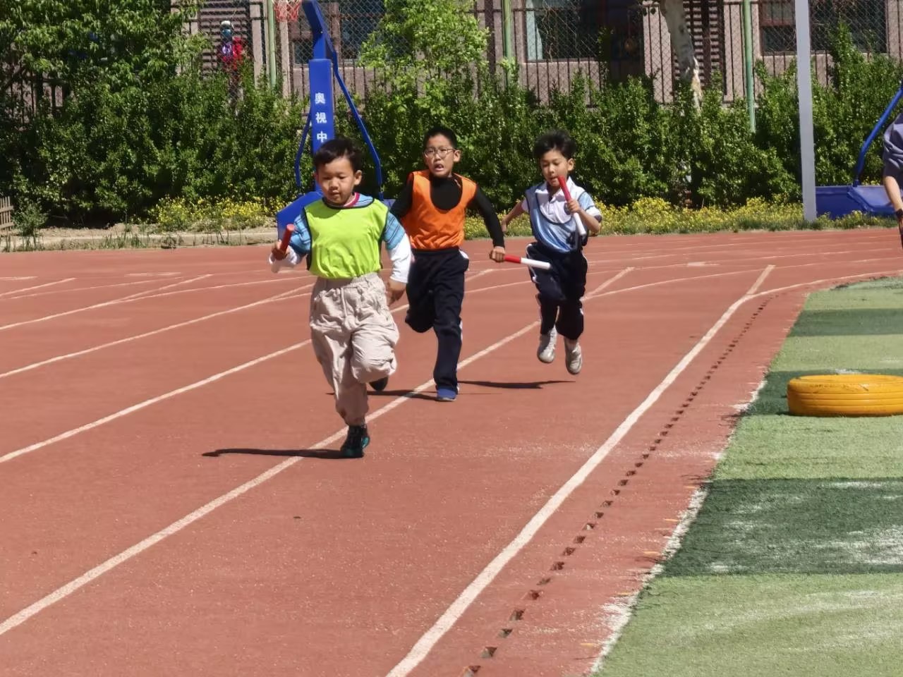 阳光倾洒,一年级的4×200米接力赛正如火如荼地展开。小小运动员们身着色彩鲜艳的背心,活力满满。他们眼神坚定,脚步飞旋,在跑道上风驰电掣,每一棒的交接都凝聚着团队的默契与拼搏,赛场氛围热烈非凡。