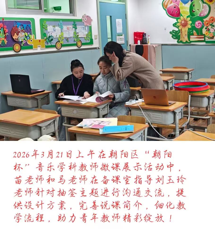 2026年3月21日上午,朝阳区“朝阳杯”音乐学科教师微课展示活动顺利开展。备课室苗铀琳老师、马晨薇老师和参赛选手刘玉玲老师知道刘老师备战。围绕抽签主题深入沟通,从设计方案、PPT制作逐一精细打磨细化,以专业力量助力青年教师在赛事中精彩绽放。
