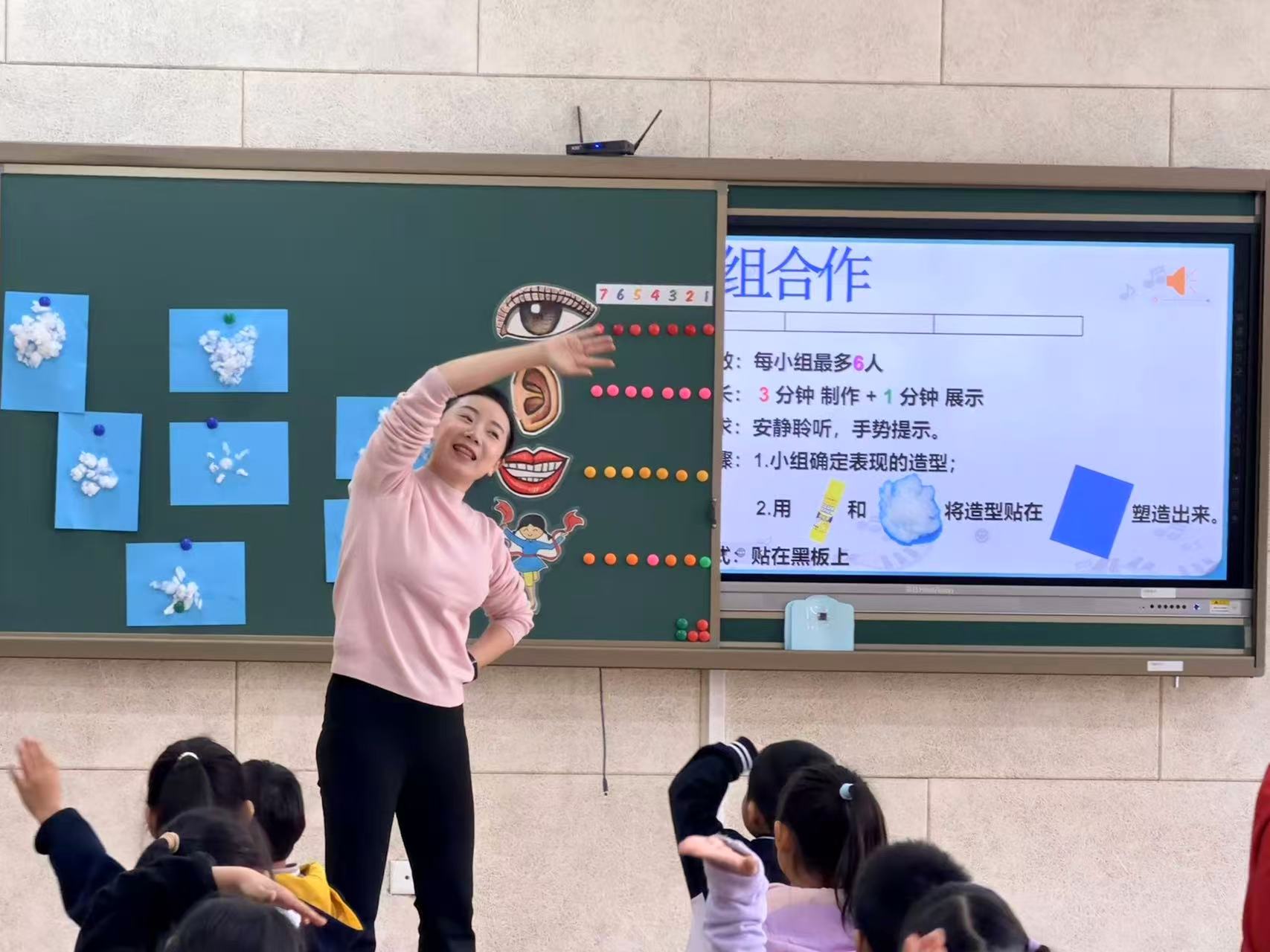 苗老师的月课中,让学生清晰学习目标。学生以合作的形式,通过手工展现云的不同形状,凸显了学生的创新思维,也体现了课程的综合性。