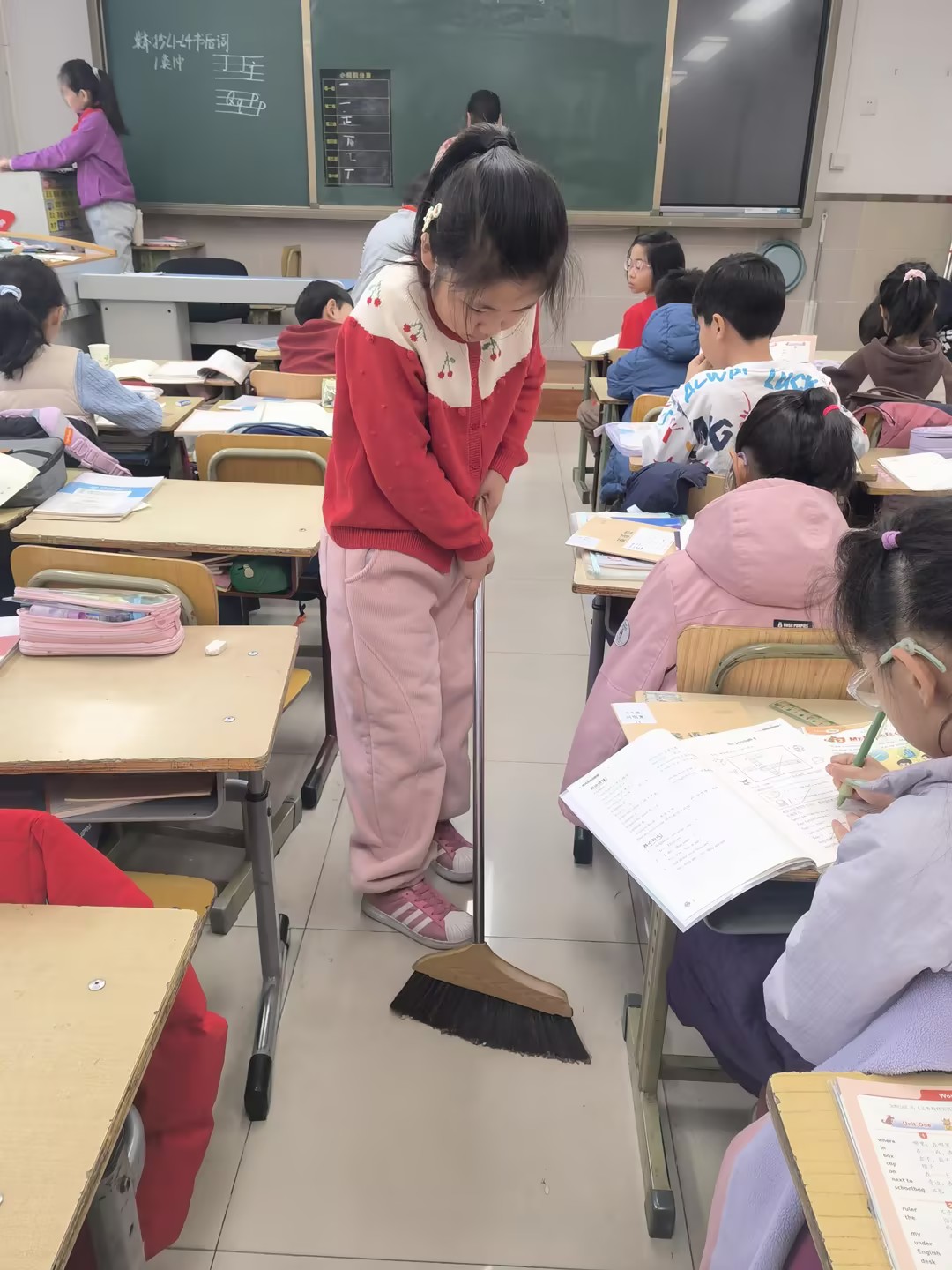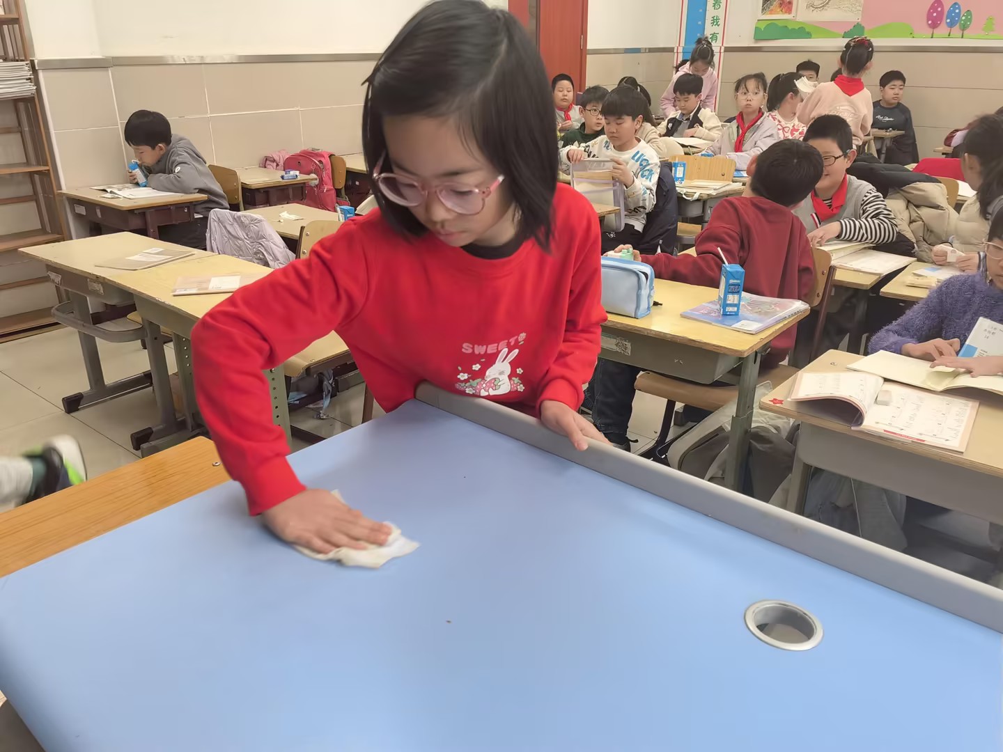 活动中,同学们化身“小小志愿者”,有的认真擦拭讲台课桌,让学习环境整洁明亮;有的手持扫帚清扫地面,不放过细碎纸屑;还有的默契配合,清扫收纳垃圾。大家不怕脏、不怕累,在劳动中践行“奉献、友爱、互助”的雷锋精神,让校园焕新颜。