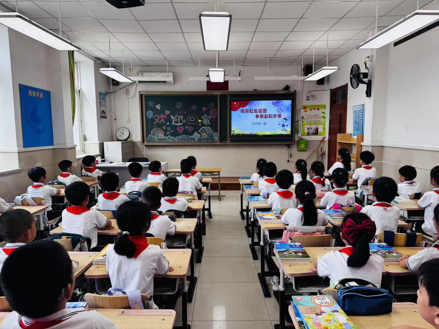 走进教室,黑板上“欢迎回家”的粉笔手绘格外暖心,气球、小屋、烟花等元素点缀其间,瞬间驱散了孩子们假期后的生疏感;而一旁电子屏上“传承红色基因 争做云鹤少年”的主题画面,又将氛围引向庄重与热烈。课堂上,身着整洁白衫、佩戴鲜艳红领巾的同学们坐得笔直,目光紧紧追随着屏幕上的红色故事:从革命先辈的奋斗历程,到“云鹤少年”精神的时代内涵,一个个鲜活片段让红色种子在孩子们心底悄然扎根。