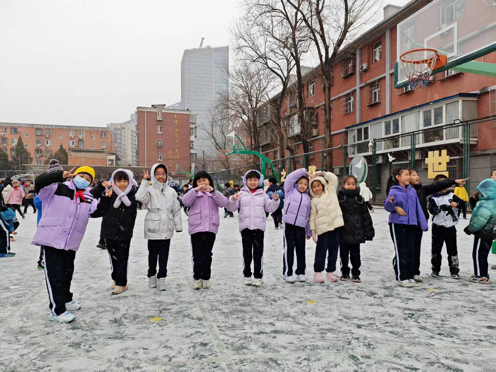 有同学惊喜地发现,雪落在冬青叶上,像给叶片镶了一道银边;有同学伸出舌头,想尝尝雪的味道,惹得同伴们纷纷效仿;还有同学拉着小伙伴的手,在雪地上踩出一串串歪歪扭扭的小脚印,那脚印像一串串音符,谱写着童年的快乐。风是冷的,雪是凉的,但孩子们的手心是暖的,笑容是甜的。这场初雪,不仅是冬日的馈赠,更是我们最好的快乐!