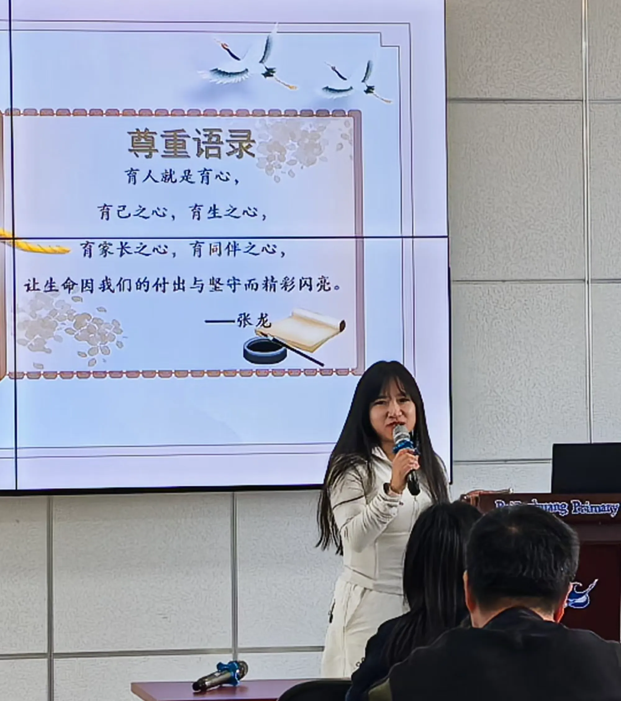 2026年3月10日珑玺校区德育主管朱艳梅主任对全体老师进行师德专题培训。以深入研读分享张龙校长的尊重语录为开篇引领,邀请抽签选出的教师代表董丽老师、张天悦老师结合自身日常教育教学工作分享实践心得。英语组主管梁丽娜副校长、六年级组长张东杰老师分别对两位老师的发言进行专业且有针对性的点评,本次培训也在精彩的分享与点评中正式拉开帷幕。