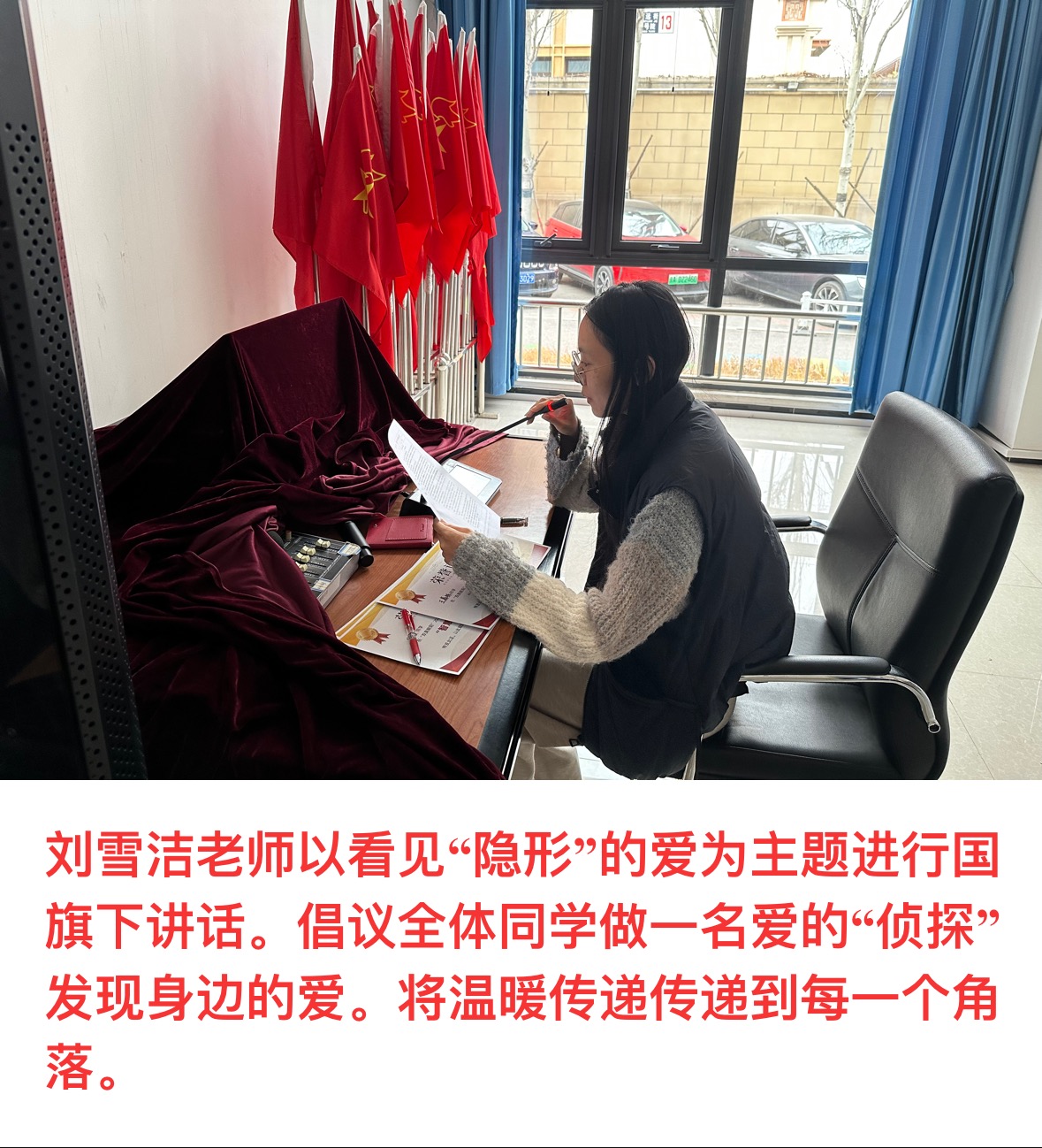 刘雪洁老师在11月24日(周一)国旗下讲话以《看见·隐形的爱》为题,唤醒了师生对日常温情的感知:这份爱藏在清晨厨房的微光里,是父母蹑手蹑脚准备的早餐;藏在深夜办公室的台灯下,是老师红笔批注里的期待;也藏在校园保安日复一日的巡逻中,是默默守护的安宁。这些爱如空气般寻常,却总被忙碌与习惯忽略。为此,刘老师发出倡议:接过早餐时,对父母说声“谢谢”;收到批改的作业时,用工整书写回应辛劳;遇见校园工作者时,报以微笑道句“您辛苦了”。她寄语大家:生活从不缺少爱,缺的是发现爱的眼睛。当我们学会看见,便懂了珍惜与回馈——让“隐形”的爱,因我们的回应而显形,让温暖在彼此间流转。
