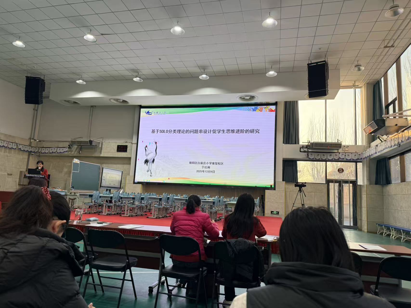 2025年12月9日 珑玺校区开展了“以党建为引领 促教育高质量发展——课题驱动研教融合,思维赋能课堂提质”为主题的科研会议,于红利校长主持会议。会议中于校长分享了基于solo分类理论的问题串设计促学生思维进阶的研究,聚焦核心问题,锚定研究靶心,教学痛点、实践难点为思考路径,为教师科研化水平指明方向