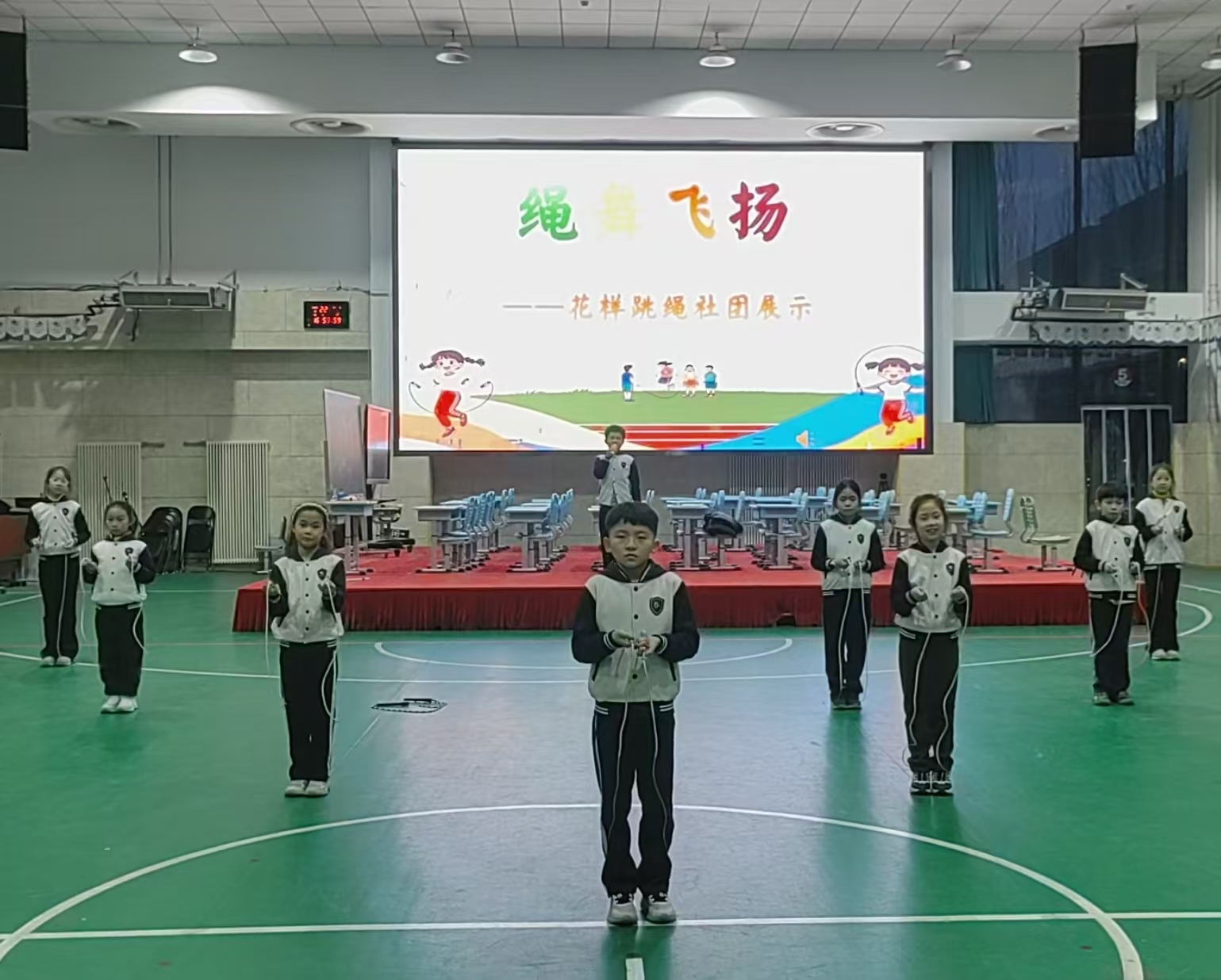 从基础动作的反复打磨,到队形变换的默契配合,再到创新元素的巧妙融入,社团成员们在训练场上挥洒汗水,精益求精。展示现场,彩绳在少年们的手中翻飞如蝶,单摇、双摇、交叉跳等动作行云流水,队形变化错落有致,每一个腾跃转身都尽显扎实功底与创意巧思。灵动的身影与缤纷的跳绳相映成趣,赢得了大家的阵阵喝彩。