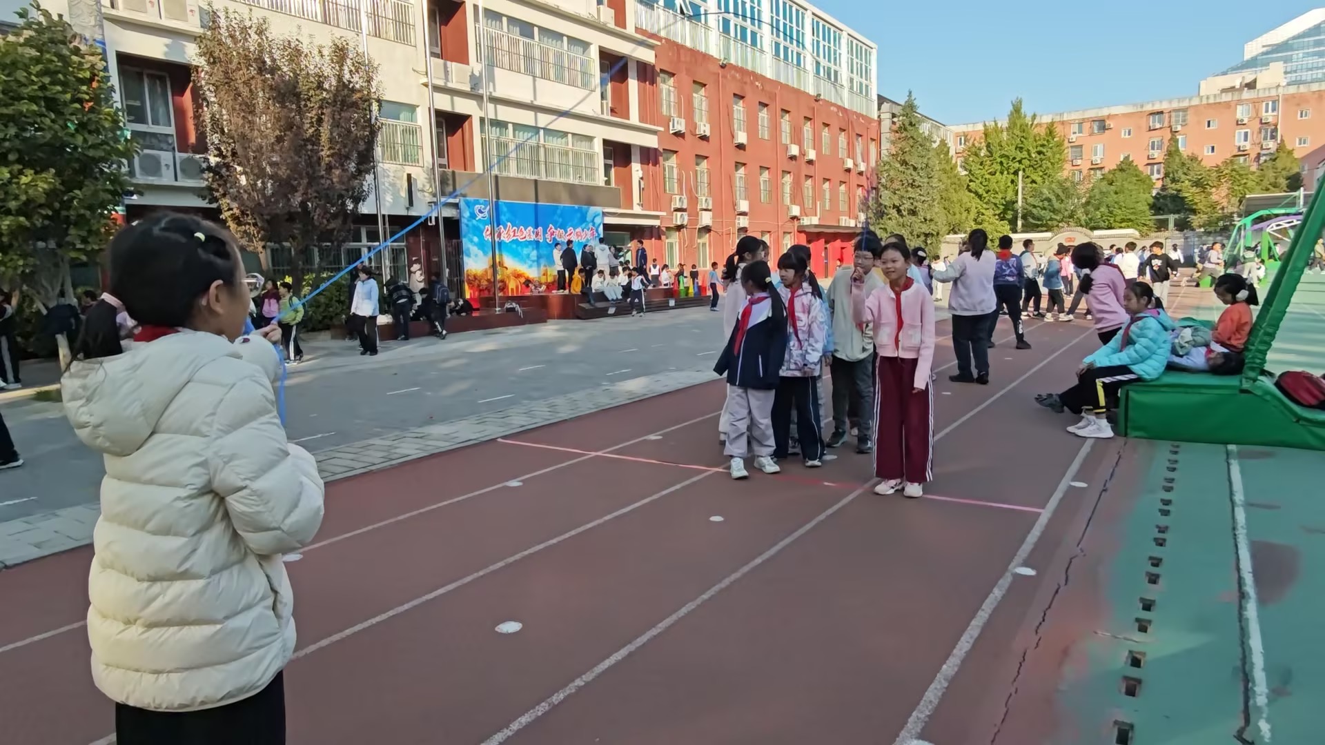 “预备——跳!”伴随着清脆的口令,操场上响起了绳子抽打地面的“啪嗒”声。现在的课间操与长绳运动相结合,让原本单一的课间时光变得活力十足。