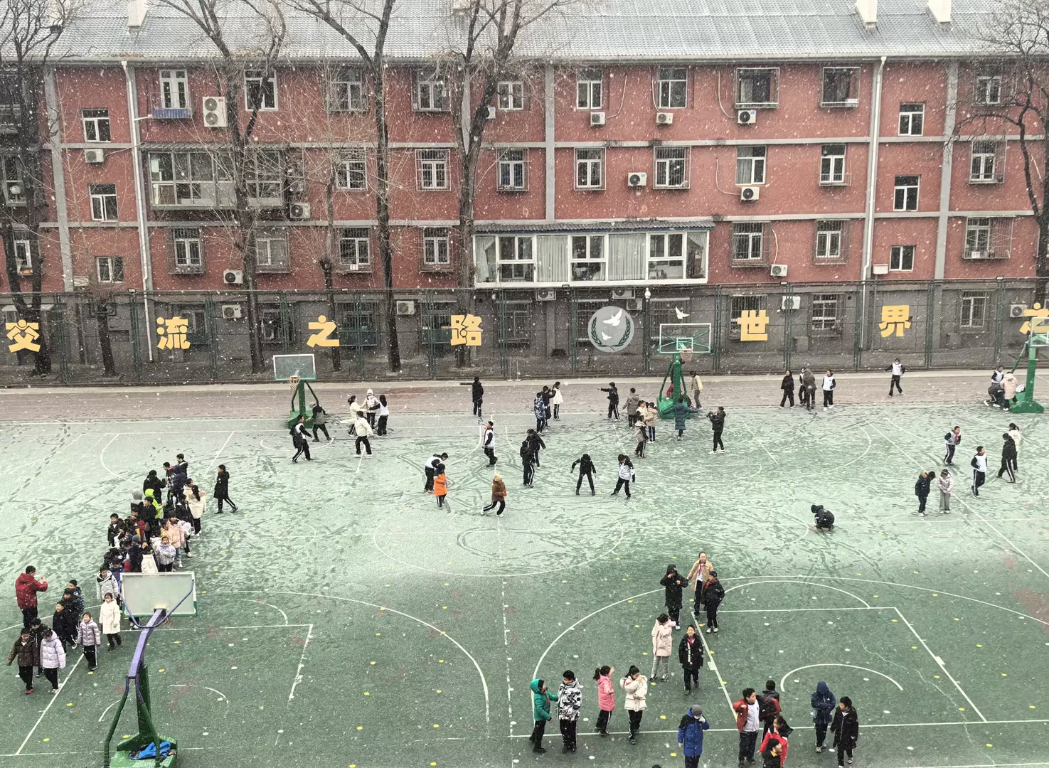 2025年12月12日,北京今年冬季的第一场雪如约而至。白家庄小学的学生有序到操场参加体验活动。尊重自然,体验寒冬自然气候——雪天。