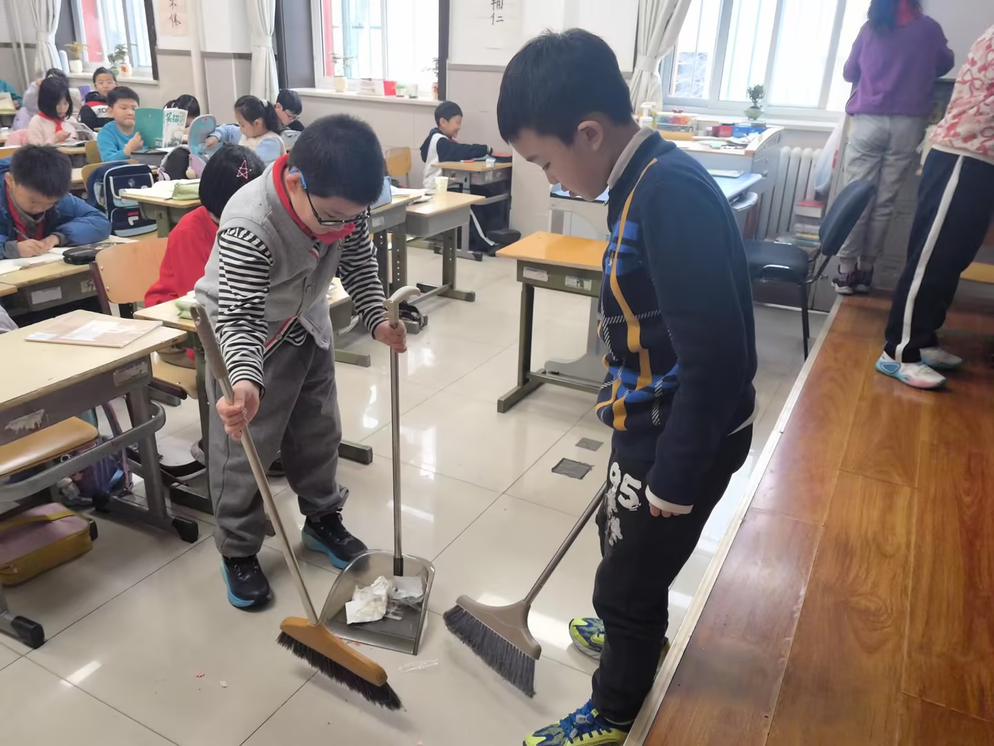 活动中,同学们化身“小小志愿者”,有的认真擦拭讲台课桌,让学习环境整洁明亮;有的手持扫帚清扫地面,不放过细碎纸屑;还有的默契配合,清扫收纳垃圾。大家不怕脏、不怕累,在劳动中践行“奉献、友爱、互助”的雷锋精神,让校园焕新颜。