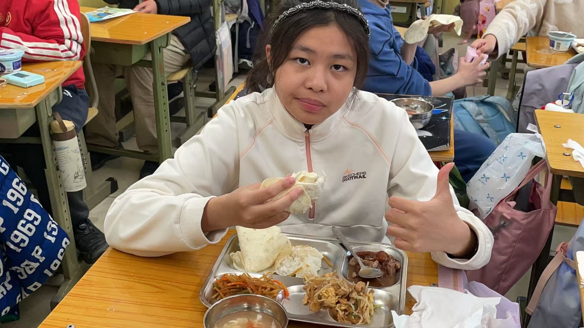 送餐阿姨推着保温餐车缓缓走来,浓郁的香气顺着餐车缝隙漫进教室,瞬间勾起了孩子们的食欲。“哇!好香啊!”“是春卷!我最爱的春卷!”小声的欢呼此起彼伏,一张张稚嫩的小脸上,满是藏不住的期待,眼神亮晶晶的,像盛满了星光。