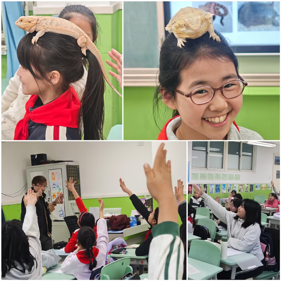 老师细致耐心地讲解蜥蜴、蛇等爬行动物的生活习性、生存特点与保护知识,用生动有趣的语言,带领大家走进神秘的爬行世界。活动中,社团还特别邀请温顺亲人的鬃狮蜥来到现场,让孩子们近距离观察、轻柔互动。大家在安全有趣的体验中亲近自然、感受生命,不仅学到了科学知识,也锻炼了胆量,收获了快乐、勇气与难忘的成长记忆。